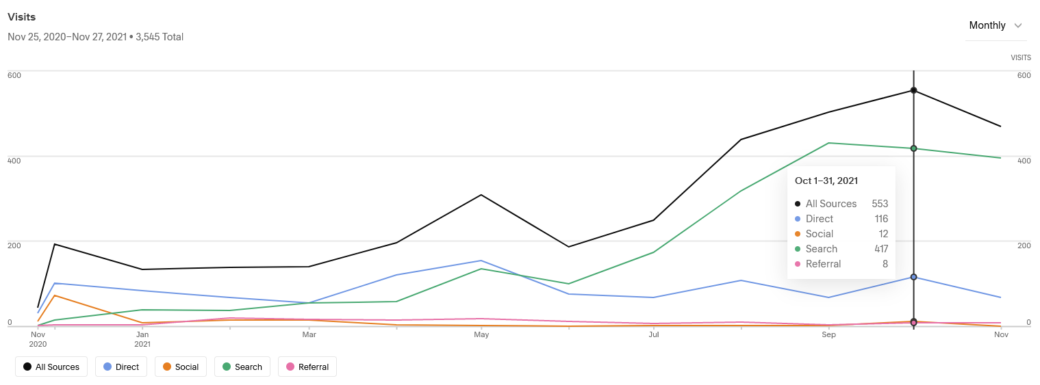 Vaikuttaa siltä, että ensimmäisen puolen vuoden ajan liikennettä tuli sivustolle pääsääntöisesti suoraan url-osoitteen kautta, mutta sen jälkeen sisältö on ilmeisesti löytänyt tiensä Googlen hakukoneeseen, mikä on moninkertaistanut liikenteen määrän.
